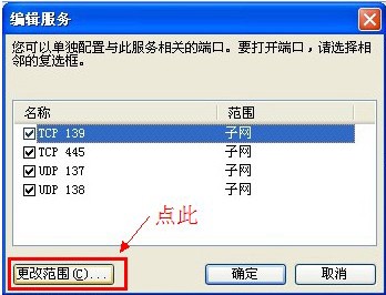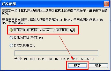 ③在打开的"更改范围"窗口中选择"任何计算机(包括Internet上的计算机)",然后点击"确定"即可。