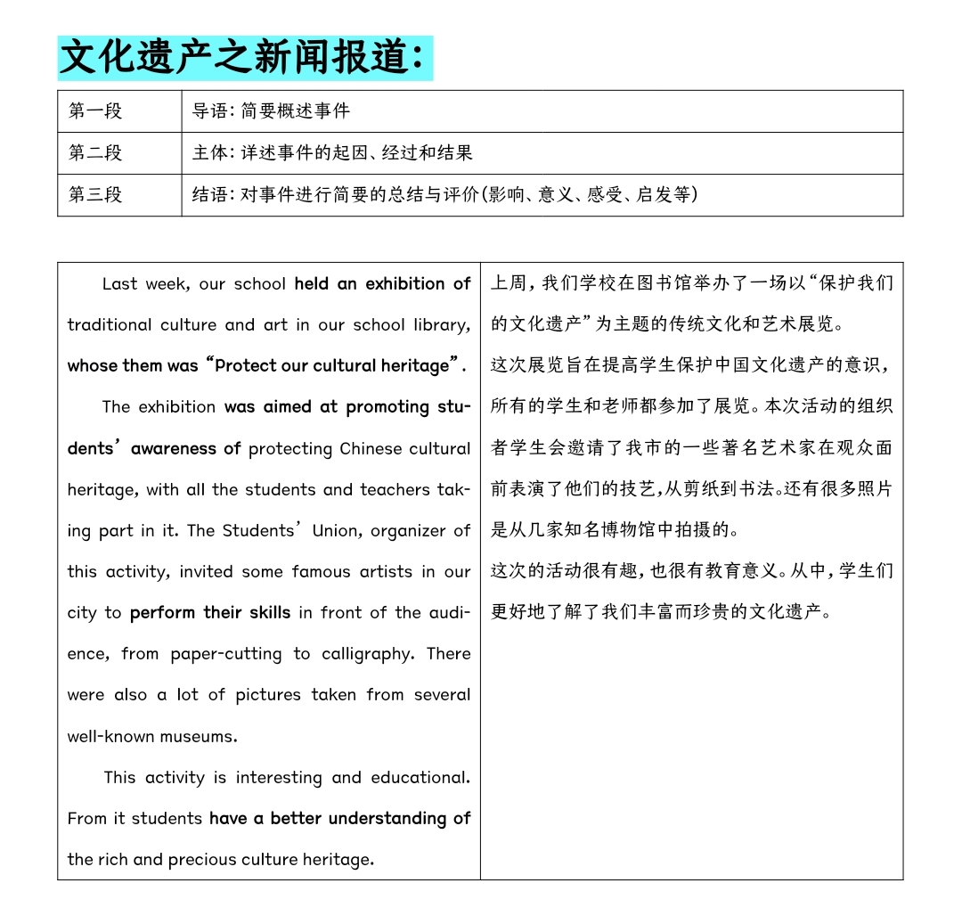 假定你是学校英语报的编辑李华,你校上周举办了一场主题为“保护我们的文化遗产”的传统文化艺术展,请你就此活动,写一篇英文报道。内容包括: